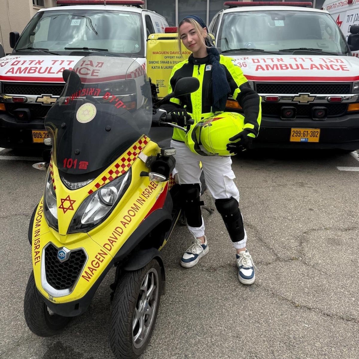 על אופנוע צהוב של מגן דוד אדום, במעיל רכיבה קשוח, מגני ברכיים וקסדה שממנה מבצבץ כיסוי ראש ומעט שיער בלונדי שמתנפנפים ברוח, חובשת רפואת חירום במד"א שירה רות חן, בת 24 מראשון לציון