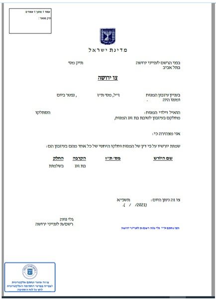 כחלק מהתהליך יהיה עליכם כמובן את פרטי כל היורשים, אופן חלוקת הירושה בהתאם לחוק הירושה, וכל מדע אחר שיידרש.