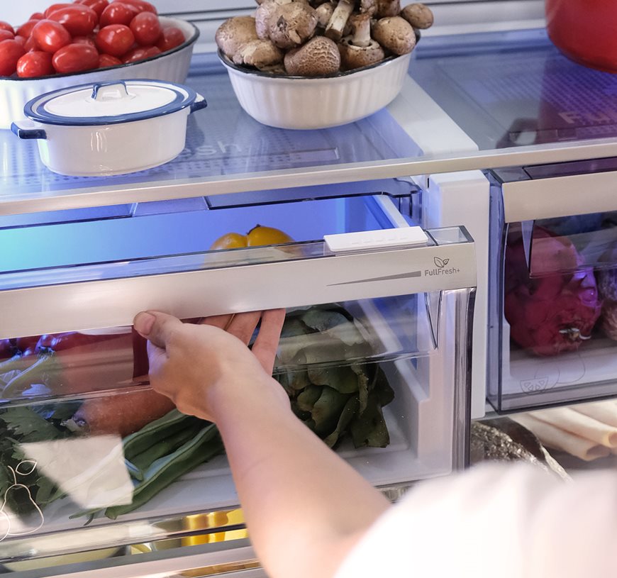 Full Fresh+ -במטרה למנוע בזבוז מזון, מגירת הצינון Full Fresh  +   מפעילה בקרה על רמות הלחות ומשפרת את זרימת האוויר כדי לשמור על טרית הפירות והירקות שלכם עד 30 ימים .