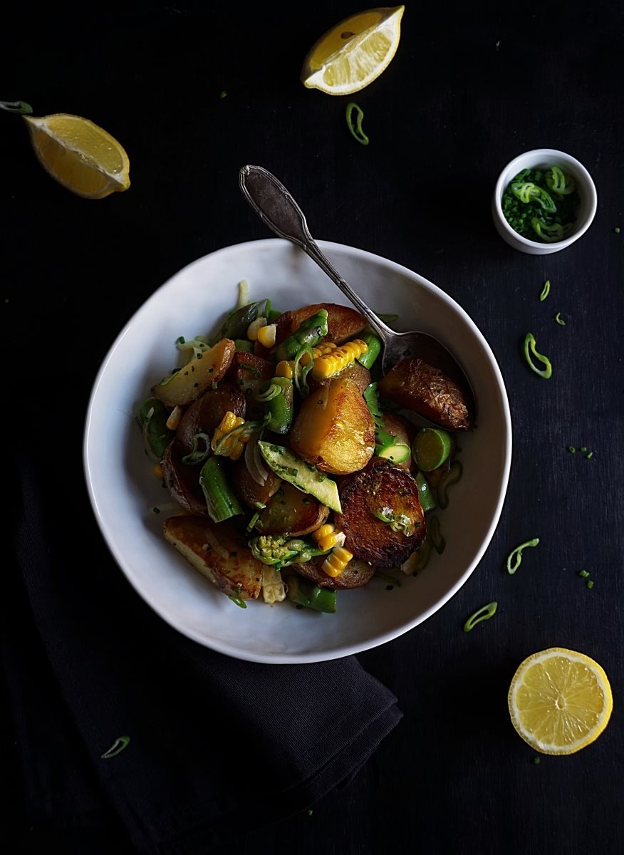 - חותכים את הבצל האביבי לרצועות, לוקחים את גרעיני התירס ומוסיפים לצלחת תפוחי האדמה.