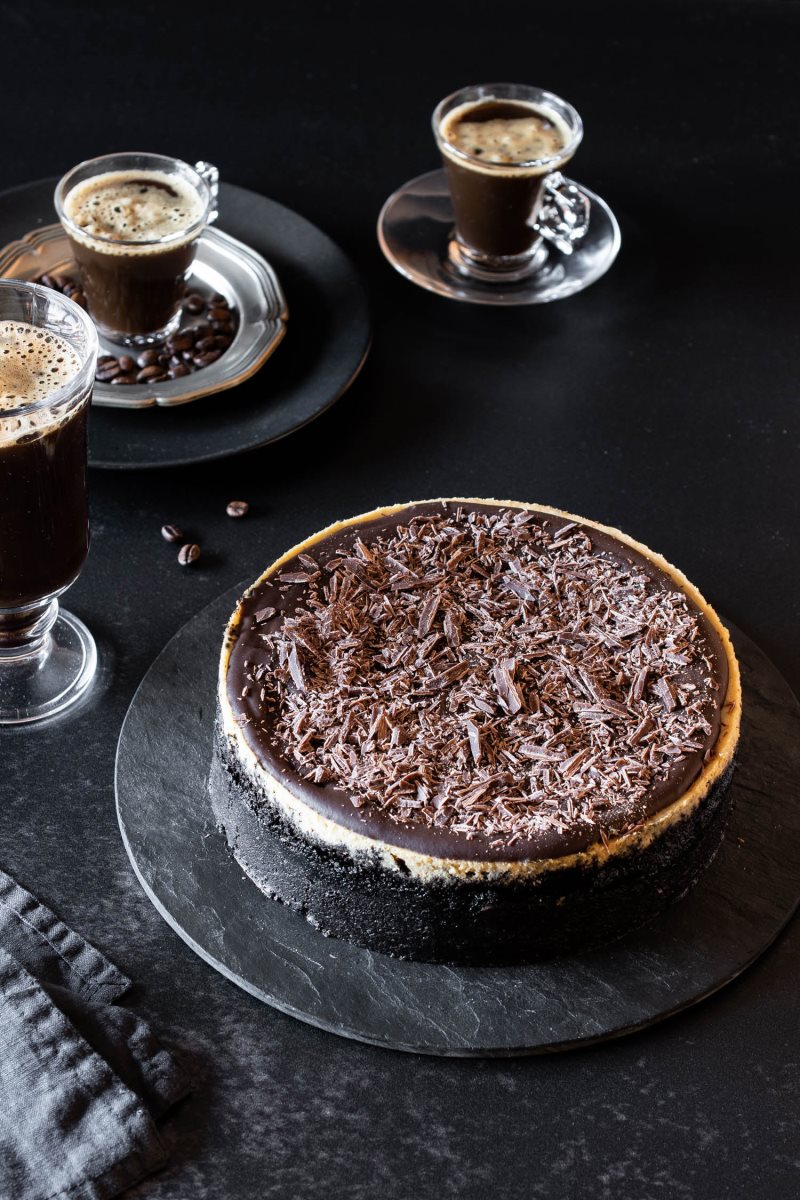 מכסים את עוגת הגבינה בתבנית בשכבה דקה של גנאש שוקולד.