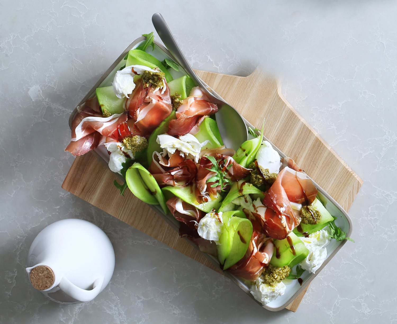 מנה איטלקית מפנקת במיוחד- פרושוטו עם מלון, מוצרלה ופסטו