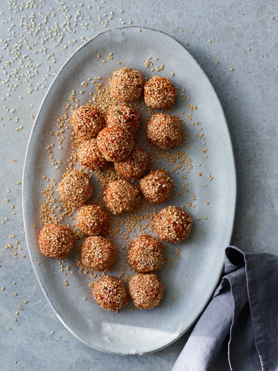 - מניחים את השומשום, אגוזים טחונים ופפריקה בקערה שטוחה. מגלגלים את כדורי הגבינה בתערובת לציפוי.