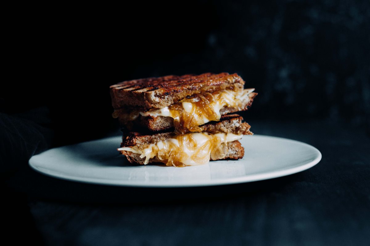 מרכיבים את הכריך עם הבצל המקורמל, כמה פרוסות גבינה טבעונית ותפוח מבושל לפי הטעם. מניחים את הלחם על הגריל ומבשלים עד שהלחם חום זהוב ופריך.