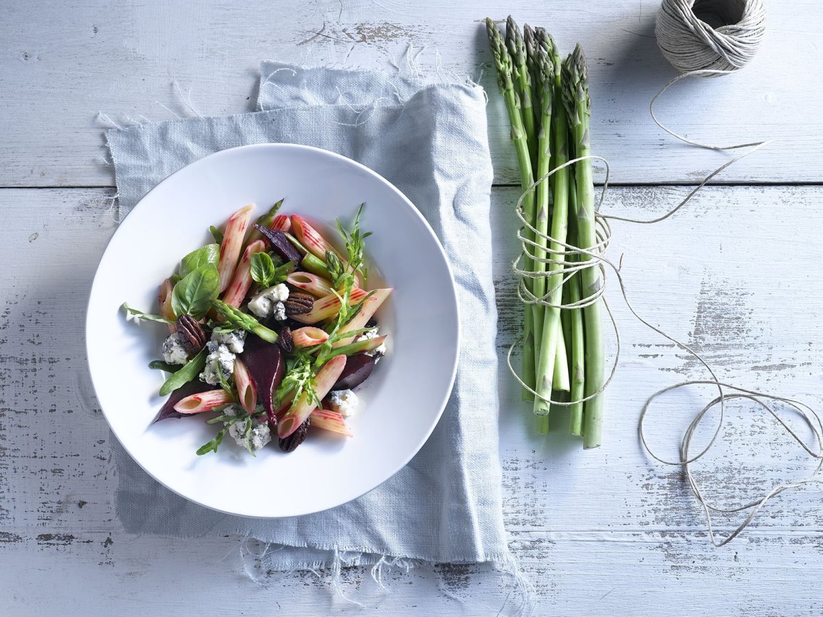 סלט פסטה, סלקים צלויים, גבינה כחולה ואגוזים