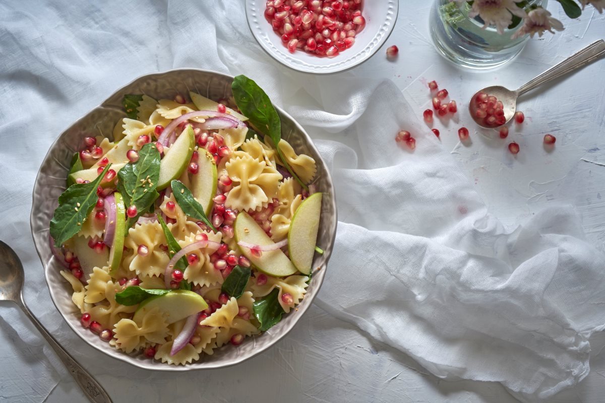 סלט פסטה עם רימונים, תפוחים ודבש. קל להכנה, טעים, מעשיר ומקשט כל שולחן חג