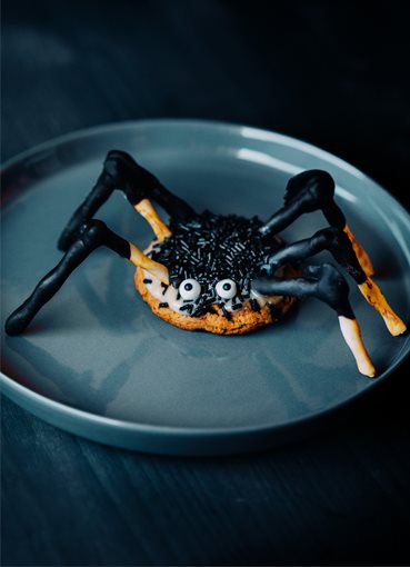 מוציאים את העוגיות מהמקרר, מניחים את הרגליים מעל חמאת הבוטנים בתוך החורים ומקשטים את החלק העליון בשוקולד צ'יפס.