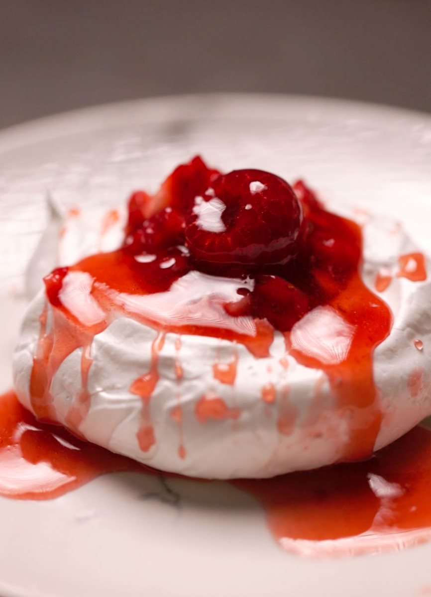 בודקים אם המרנג התקשה ומניחים לו להתקרר לפני שמקשטים את החלק העליון. ממלאים את הפבלובות בפירות יער אדומים לפי הטעם ובמעט סירופ תות.