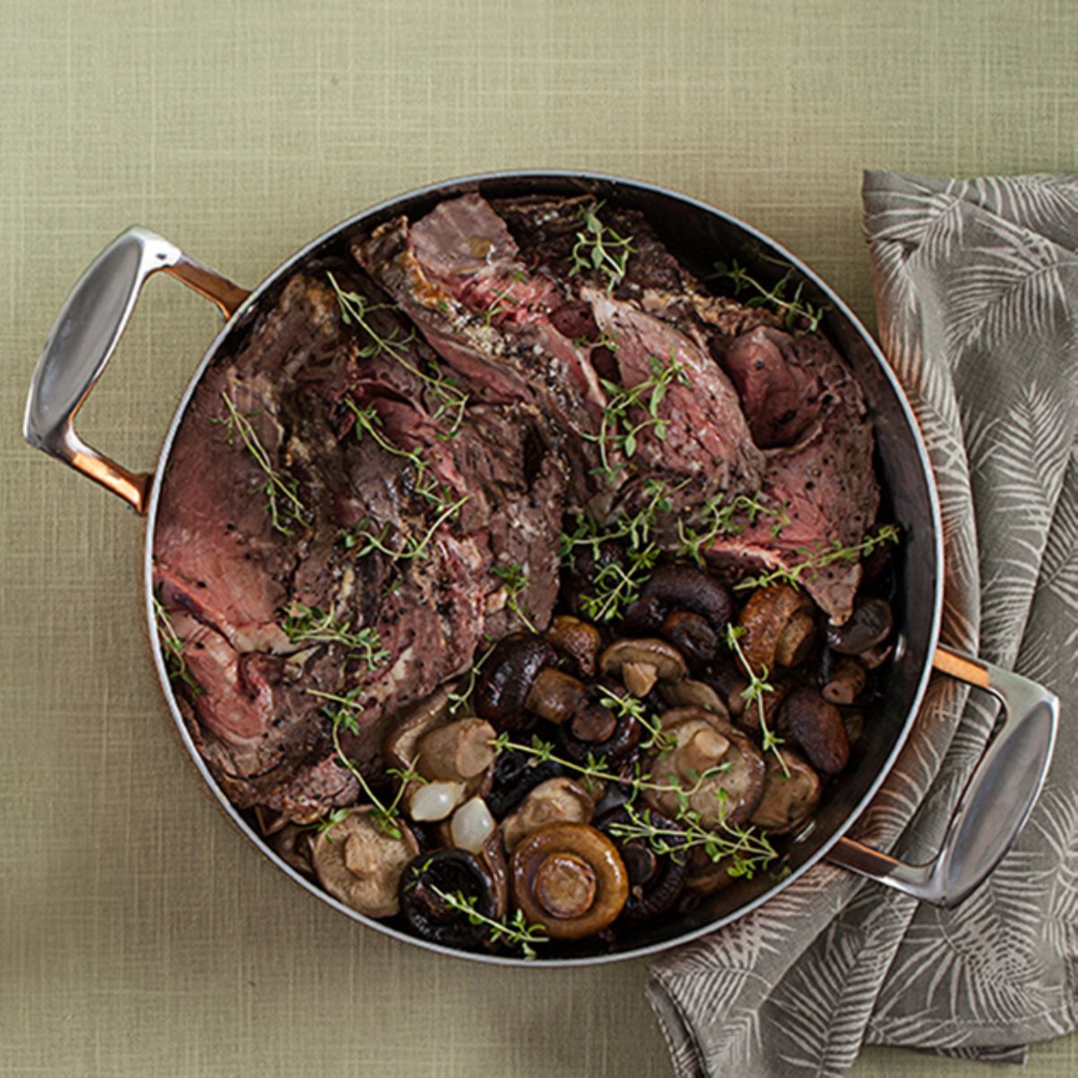 הבשר והפטריות מרוויחים מבילוי משותף בתנור, ורכז הרימונים מעמיק את הטעמים ומהווה בסיס לרוטב העסיסי. זכרו להוציא את הנתח מהקירור לפחות שעה וחצי לפני תחילת הצלייה.