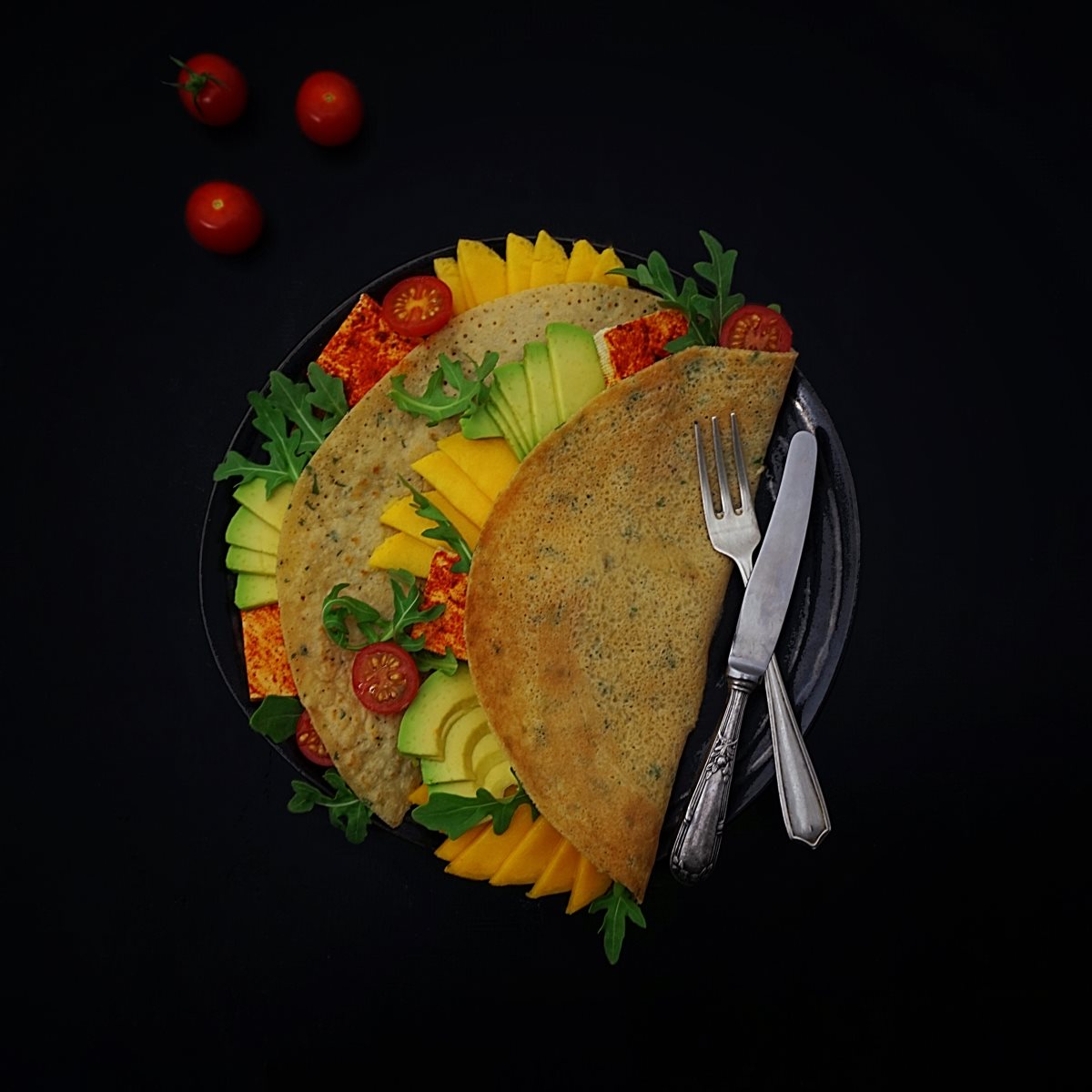 ממלאים את הקרפים בפרוסות טופו, אבוקדו חתוך לקוביות עם כמה טיפות מיץ ליים, מנגו פרוס, עגבנייה וסלט רוקט.