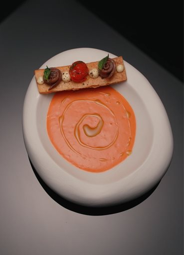 מגישים את הגספאצ'ו בקערה, שמים מעל את הטוסט ומקשטים בעגבניות השרי, שני אנשובי מגולגלים וקצת עלי בזיליקום ושמיר. לבסוף, יוצקים מעט שמן בזיליקום על הגספאצ'ו.