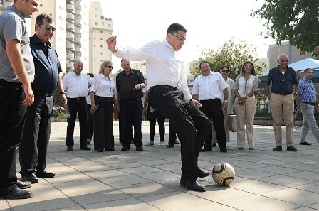שר החינוך גדעון סער מלהטט בכדור עם תלמידי מקיף ה'