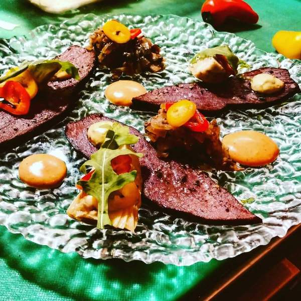 חציל בלקני (36 ₪) מוגש על מחבת חמה בתוספת סלט עגבניות תמר, פלפלים קלויים וגבינת פטה.