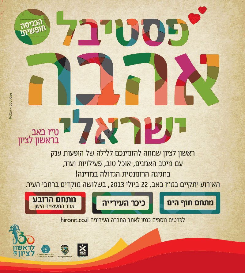 ראשון לציון שמחה להזמינכם ללילה של הופעות ענק עם מיטב האמנים, אוכל טוב, פעילויות ועוד בחגיגה הרומנטית הגדולה במדינה. האירוע יתקיים בט"ו באב, 22/7 2013 בשלשה מוקדים ברחבי העיר.