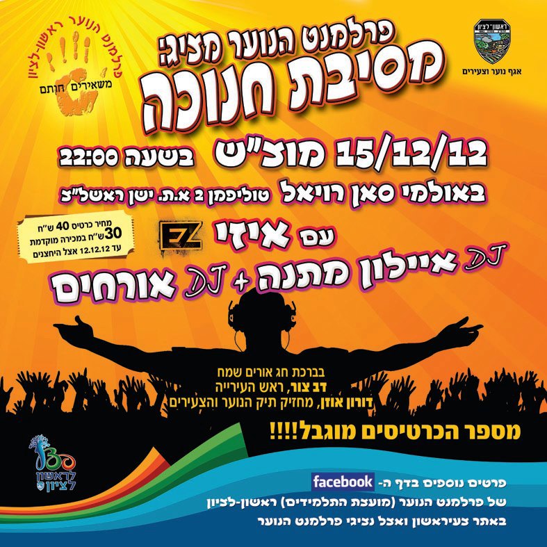 מסיבת חנוכה של פרלמנט הנוער בראשון לציון תתקיים בערב מוצ"ש באולמי סאן רויאל באזור התעשיה הישן של ראשון לציון בשעה 22:00- מספר הכרטיסים מוגבל. המסיבה בחסות ראש העיר ומר דורון אוזן מחזיק תיק הנוער והצעירים.