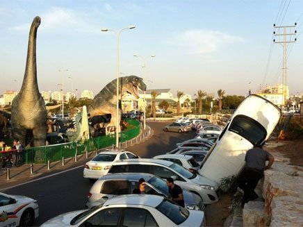 רק כעבור שעה, אחת מבעלות הרכב שנפגע באירוע חזרה לאזור הרכב - ונדהמה לגלות את המראה החריג. היא הזיזה לבקשת השוטרים את הרכב מהחניה - ולא נזקקה לגרר. "הרבה אנשים יוצאים מהקניון בשביל לראות מה קרה. מאחר והתאונה לא התרחשה על הכביש העמוס אין פקקים, אבל ההתקהלות גדולה והילדים מצטלמים במקום עם הדינוזאורים הגדולים - ועם הרכב. הרבה אנשים מתעכבים כאן בדרך החוצה מהקניון ובדרך פנימה. דבר כזה לא רואים כל יום".