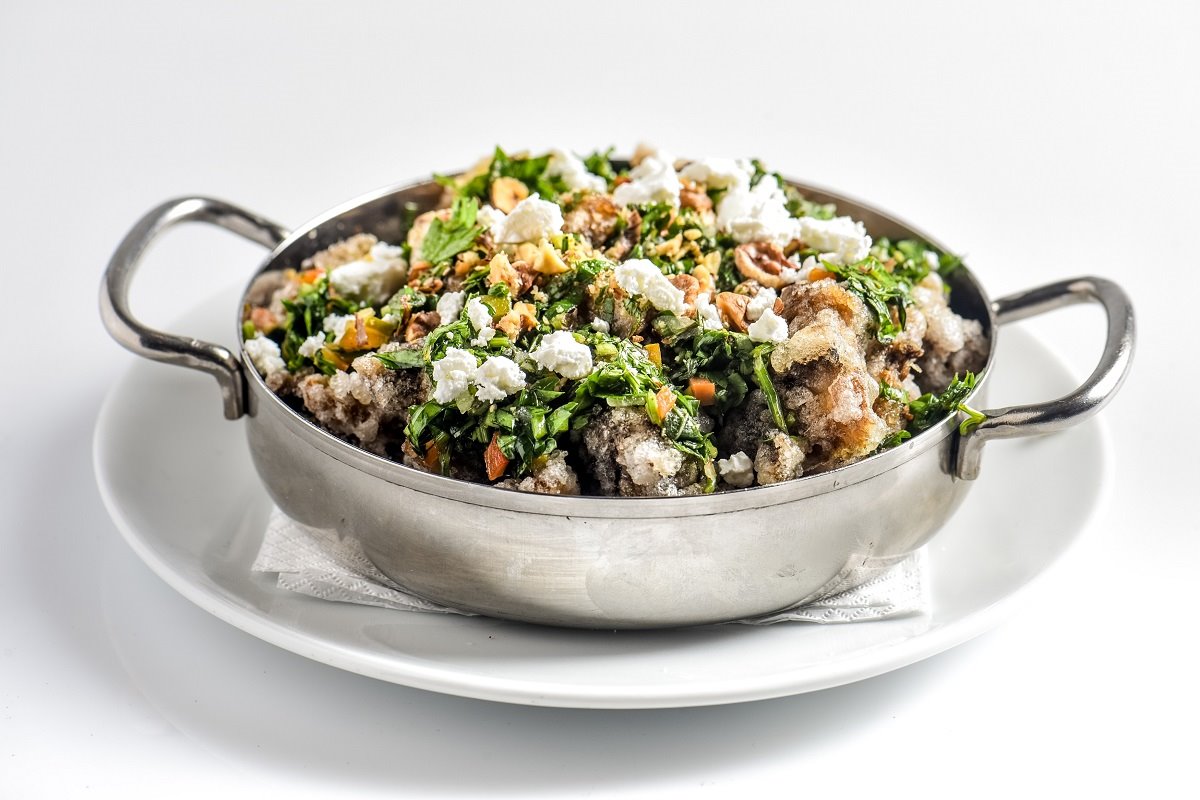 - מניחים את הפטריות המטוגנות בצלחת הגשה עמוקה ומזלפים מעט שמן זית ולימון סחוט, מפזרים מעל את הצימצורי ומפוררים את גבינת הפטה, מפזרים את אגוזי המלך השבורים מעל הכל.