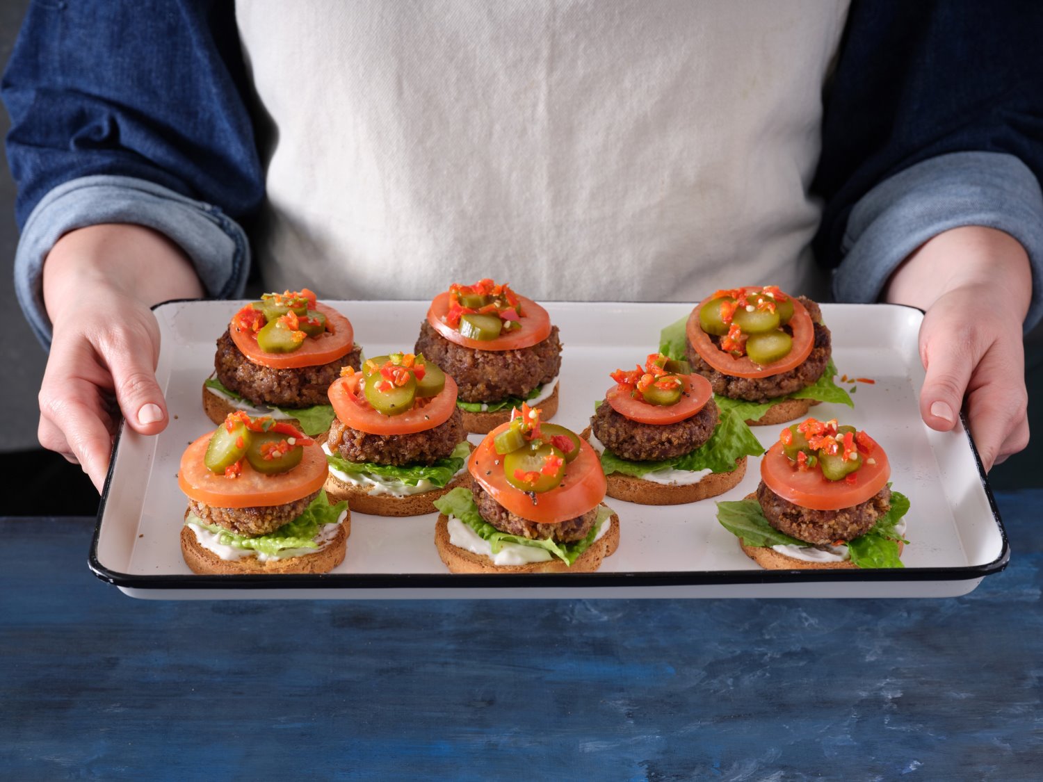 לאחר הצלייה מניחים על כל צנים עגול קציצה עסיסית ומוסיפים רטבים שאוהבים.