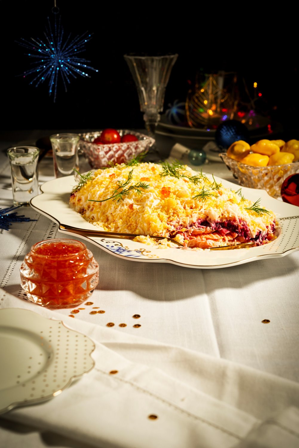 ברוסית Новый Год - השנה החדשה - "שובה" סלמון צלוי – סלמון במעטפת סלק, שמנת חמוצה וביצה.