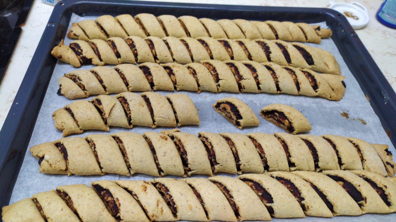 - מגלגלים את הבצק לרולדה ומניחים את הרולדה בתבנית עם נייר אפיה