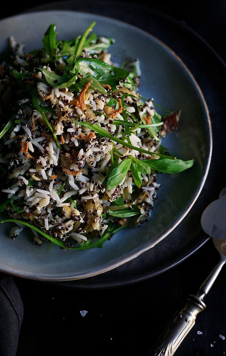 מערבבים יחד את האורז, הקינואה, עשבי התיבול השום הקצוץ וגרידת הלימון ומתבלים במיץ לימון, מלח ושמן זית. מגישים עם בצל צלוי מעל.