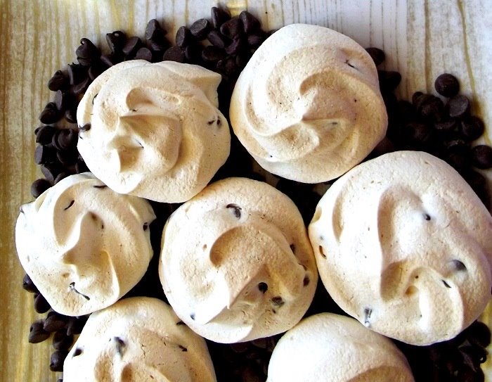 הקציפו 3 חלבוני ביצה בקערה עד ליצירת קצף יציב. הוסיפו לביצים תמצית וניל. לאט לאט, הוסיפו לקצף כוס סוכר ושבבי שוקולד לאפייה. המשיכו להקציף עד שהתערובת תהפוך לאחידה.