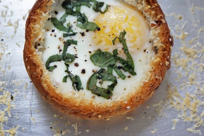 שברו ביצה לתוך הגומחה, פזרו מעליה מעט גבינת פרמז'ן והכניסו את הלחמנייה לתנור שחומם מראש לחום של 160 מעלות למשך כחצי שעה.