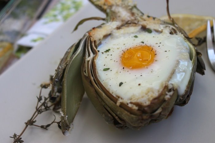 הוציאו את הארטישוק מהתנור, שברו לתוכו ביצה, ואפו שוב כ-15 דקות, עד שהביצה תהיה מוכנה. רצוי לשמור על החלמון נוזלי.