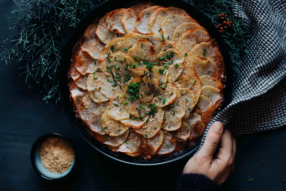 יוצקים לתבנית פאי אפייה, ופורסים את תפוח האדמה לפרוסות דקות מאוד (עדיף במנדולינה). את הפרוסות מתבלים בצורה אחידה בשמן כמהין, בפלפל, אגוז מוסקט ומעט מלח.