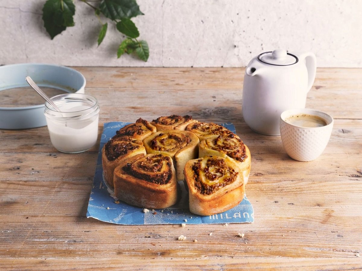 5. מורחים על הבצק את המילוי, מגלגלים, וחותכים לפרוסות של כ-3 ס"מ. שמים את שבלולי הבצק בתבנית אפייה משומנת בצמוד אחד לשני.