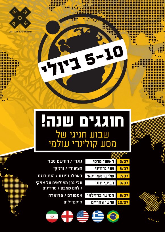 יום ו' (10.7) – שישי צהריים, מסיבת קוקטיילים קיצית מסביב לעולם.