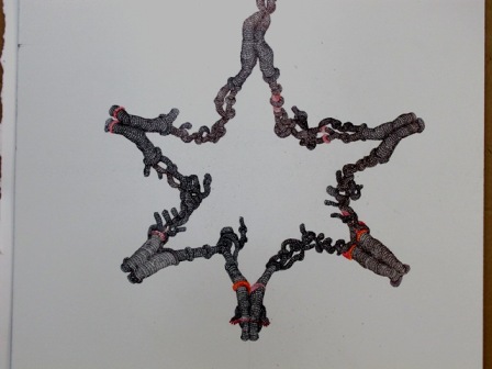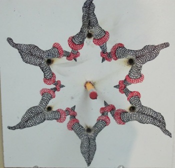 בחלל הגלריה. למתבונן מרחוק נראית צורת הרישומים על גבי מזוניט כמגן דוד, אבל מבט קרוב מגלה גופות