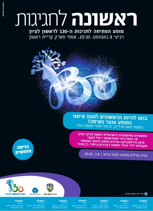 מופע הפתיחה לחגיגות ה- 130 לראשון לציון. האירוע יתקיים ביום רבעי ה- 8 לאוגוסט בשעה 20:30 באמפי פארק ראשון לציון בקריית ראשון- הציבור מוזמן.