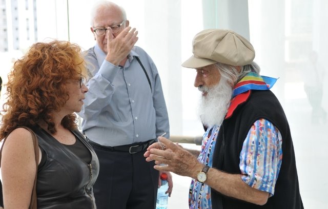 | יעקב אגם האמן, הגב' רותי מקבי מנהלת הרשות לתרבות ומרק שפס היועץ האמנותי. |