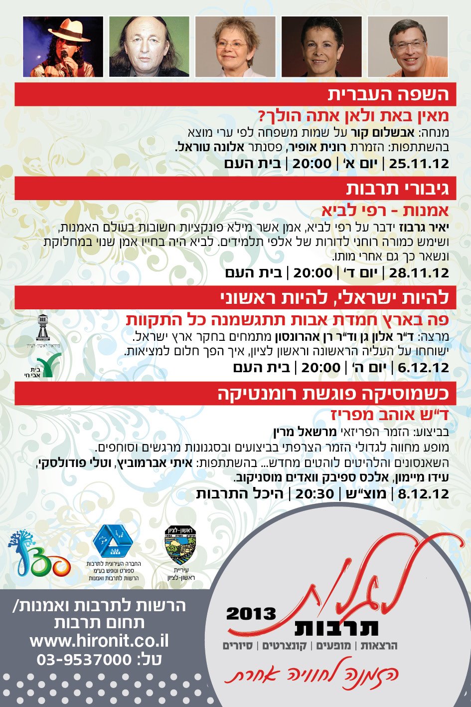 רשימת מופעים מסדרת הדגל "לגלות תרבות". תוכניה לסוף החודש ותחילת החודש הבא בנושאי השפה העברית, גיבורי תרבות, להיות ישראלי, כשמוזיקה פוגשת רומנטיקה ועוד....