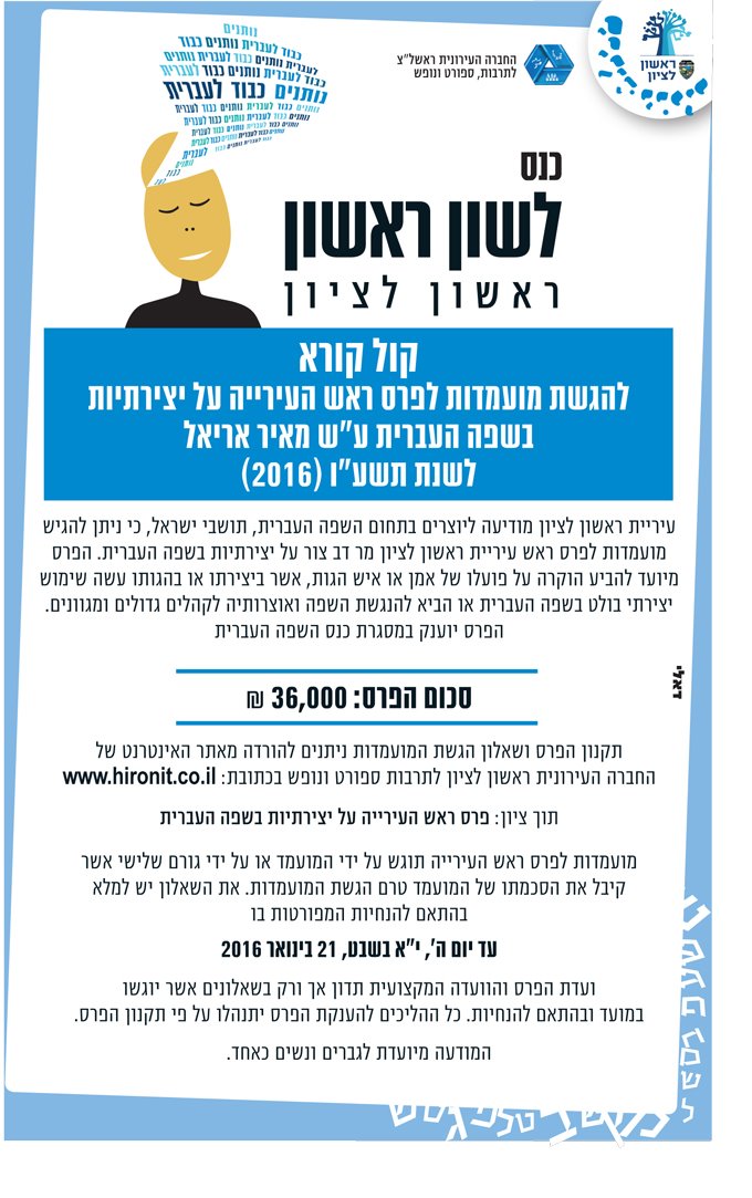 קול קורא להגשת מועמדות לפרס ראש העירייה על יצירתיות בשפה העברית ע"ש מאיר אריאל 2016.
